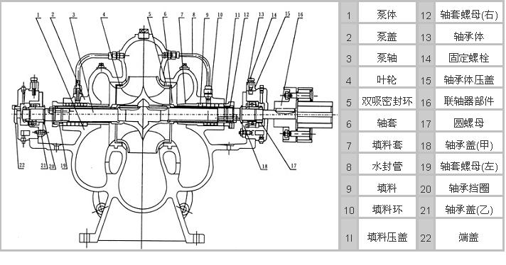 SH型單級(jí)雙吸中開離心泵是新型節(jié)能臥式中開泵,主要由泵體、泵蓋、軸、葉輪、密封環(huán)、軸套、軸承部件等組成,其吸入口和排出口均在水泵軸心線下方,檢修時(shí),只要將泵蓋揭開,即可將全部零件拆下進(jìn)行維修。供輸送清水或物理化學(xué)性質(zhì)類似水的其它液體,根據(jù)用戶需求,通過改變泵結(jié)構(gòu)及材質(zhì)可用于輸送多泥沙水或各類腐蝕性液體。其性能符合JB/1050-93《單吸雙吸清水離心泵型式與基本參數(shù)》標(biāo)準(zhǔn)。